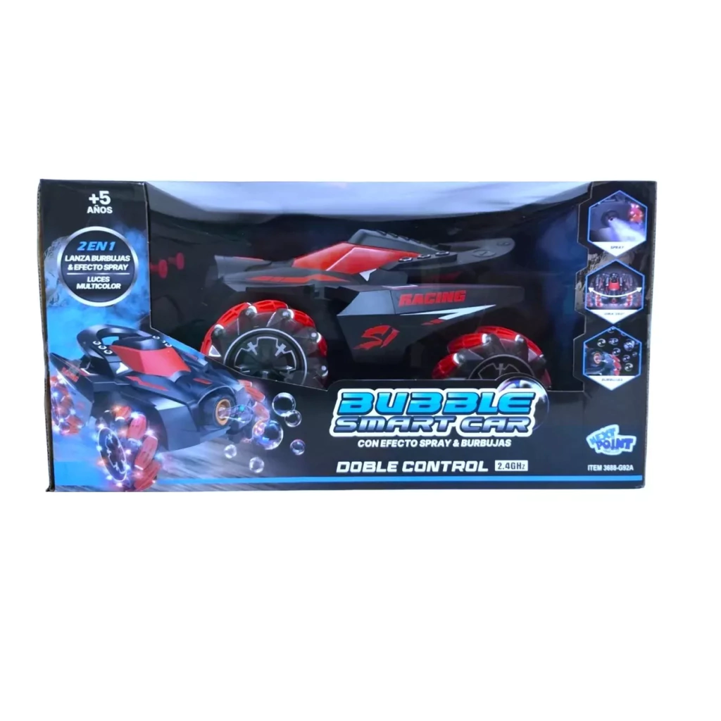 Auto A Radio Control Bubble Smart Car Lanza Humo Y Burbujas Color Negro Personaje Bubble Smart 360' es un vehículo asombroso que se desplaza en todas direcciones. Cuenta con luces brillantes, sonidos realistas, un sistema de lanzamiento de humo para una experiencia inigualable y una máquina de burbujas para un toque de magia.