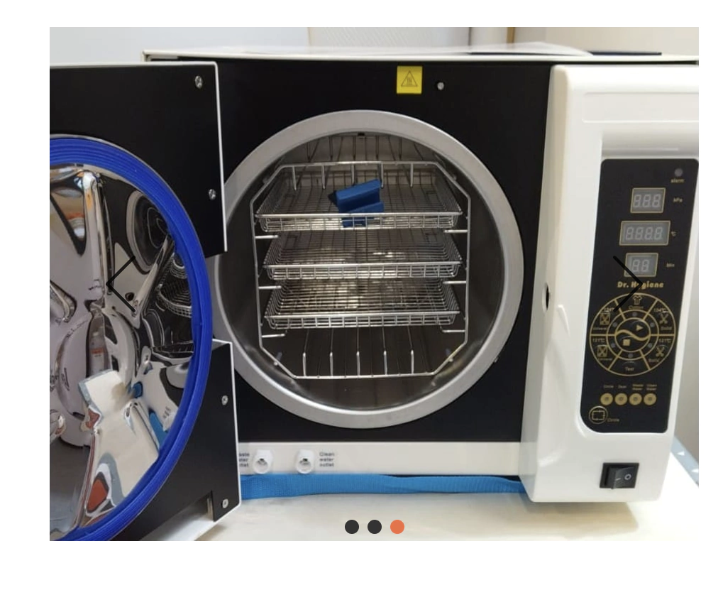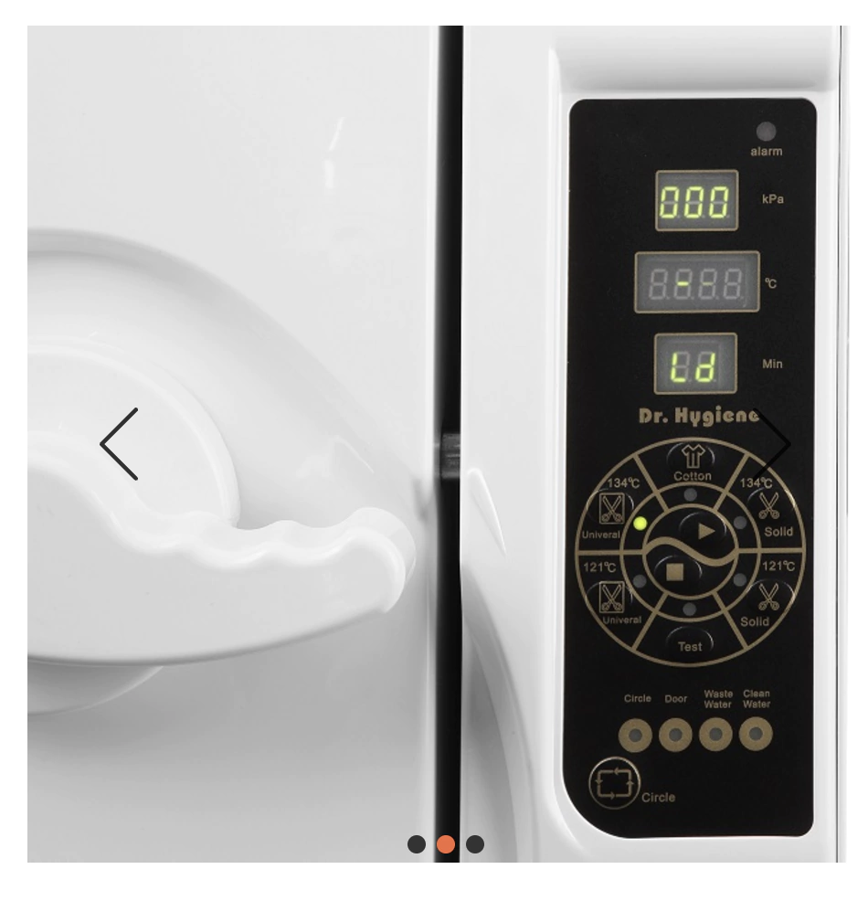 Descripción del producto:Autoclave clase B modelo Básico Dr Hygiene --eficiencia+bajo costo+facilidad de operación --esterilización consistente y segura de Clase B --certificado de calidad TUV Aleman BENEFICIOS AL USUARIO **4 programas: Algodón/textiles -- universal -- sólidos -- test/prueba **Información del mantenimiento del ciclo de esterilización **El mejor retorno a la inversión **Cámara de acero inoxidable SS304 con 10 años de garantía **Seguridad de operación gracias al sistema de Auto air-switch ESPECIFICACIONES Capacidad: 18 litros 3 bandejas Dimensiones: 445x390x660mm Cámara: 253x350mm largo Peso bruto: 47 kilos Temperaturas Programables: 134ºC - 121ºC Sistema de Seguridad: electro-magnetico Potencia: 1750W 220v50hz Impresora: opción no incluido carga de agua por tanque superior Marca: GDK