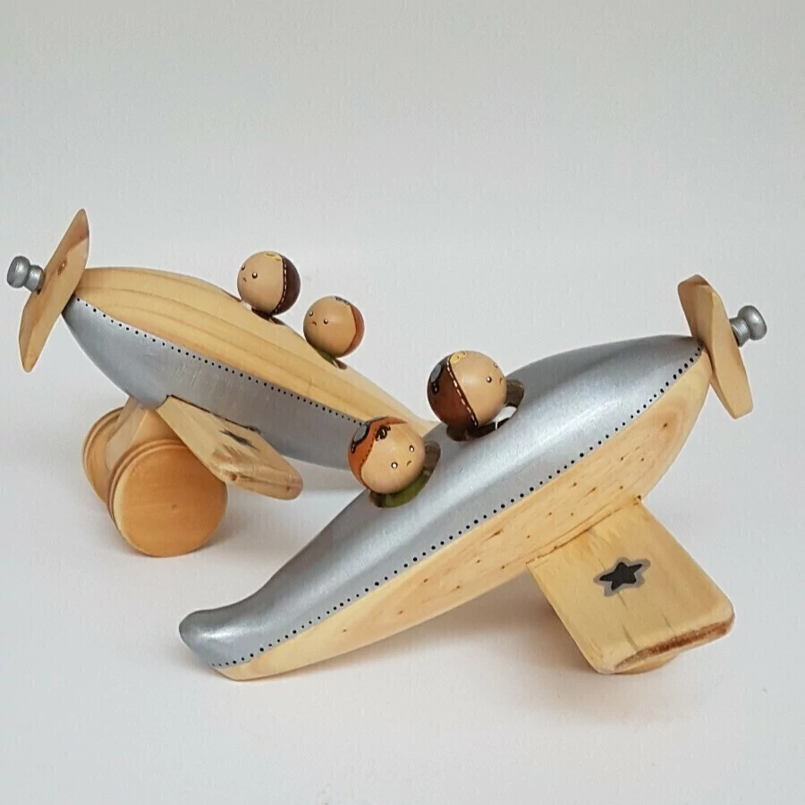 Este encantador avión de madera está diseñado para inspirar la imaginación de los más pequeños. Con dos pilotos de madera pintados a mano, cada vuelo se convierte en una aventura única.