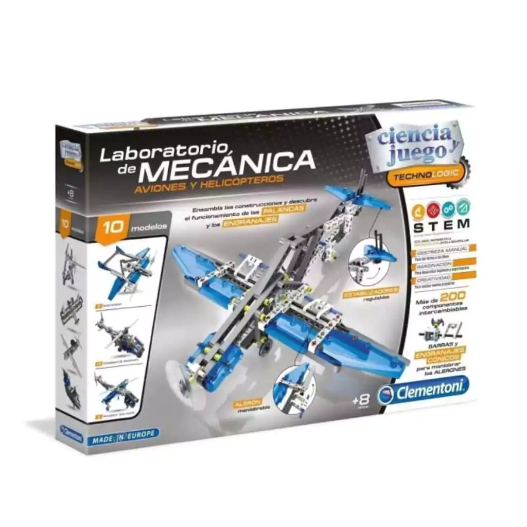 Detalle-Juego de mecánica-Un kit científico para descubrir y experimentar los mecanismos de vuelo-Con más de 10 modelos para armar y 200 componentes incluyendo: varillas, barquillas, paneles, hélices, ruedas dentadas, poleas y articulaciones universales.-Incluye mucha información para profundizar sobre la historia del vuelo y demás, el manual ilustrado enseñara al niño como montar cada modelo-Medidas: 6x40x28-Edad recomendada 8 años