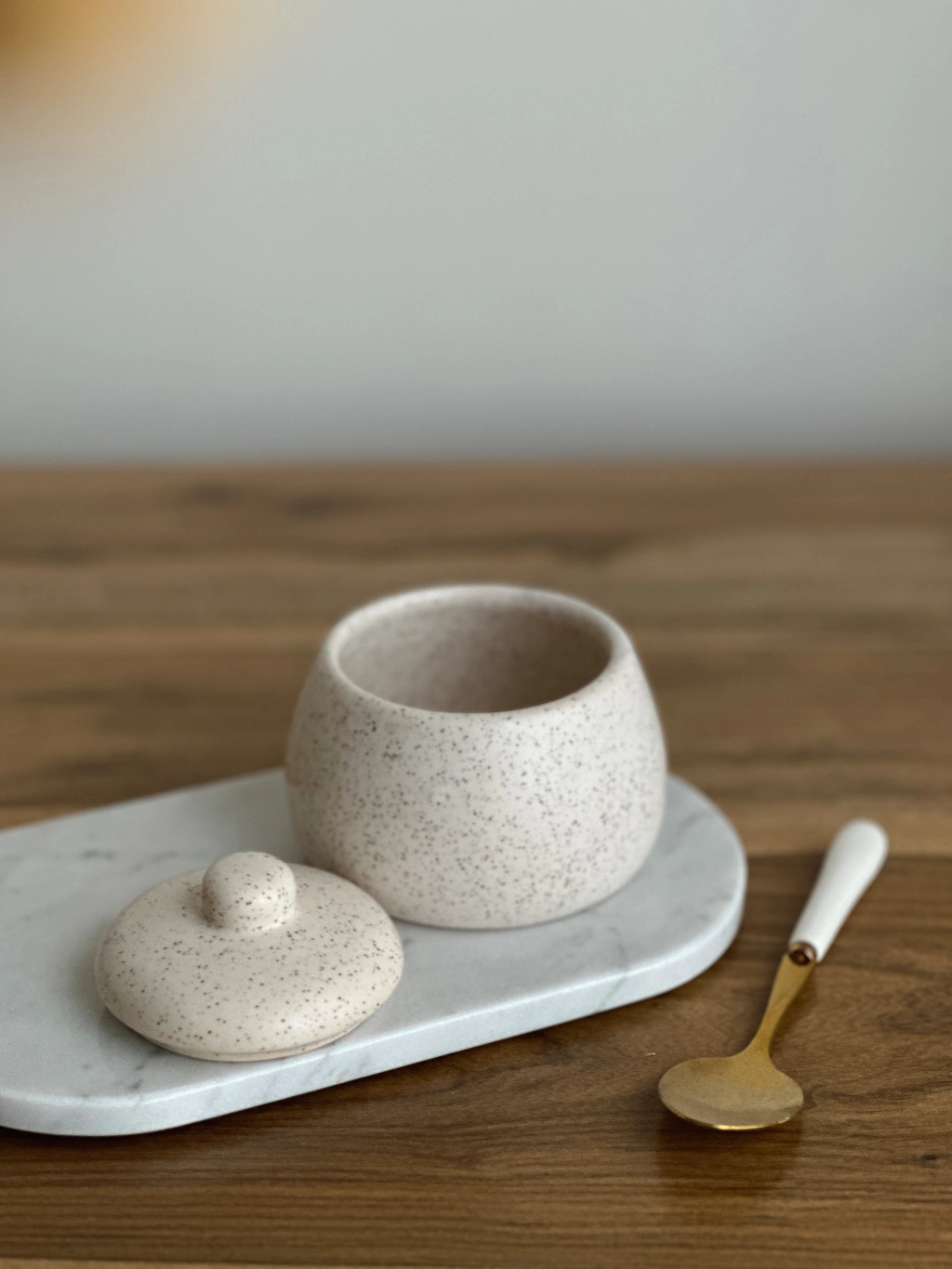 DESCRIPCIÓN:Azucarera de cerámica con tapa de color blanco jaspeado esmalte mate. Ideal para combinar con la taza y copetinero deleite.MEDIDAS APROX:8cm x 9cmIMPORTANTE: el envío de este producto está disponible para TODO el territorio argentino.