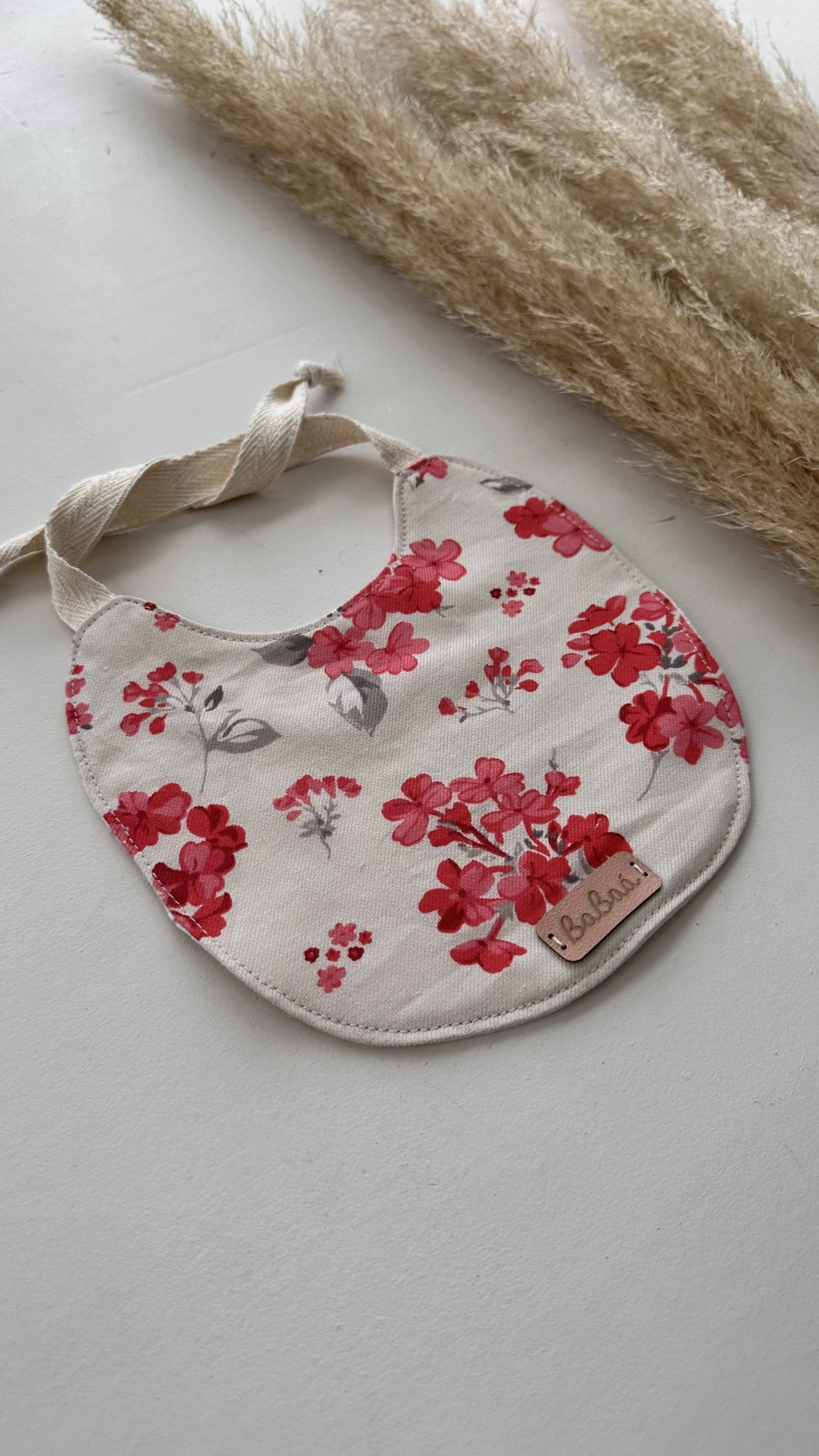 Babero BibsMaterial: gabardinaColor: flores rosasDetalles: Etiqueta de ecocuero y cordon de algodon