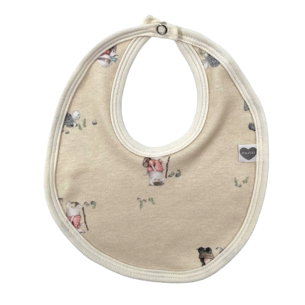 Babero en algodon doble (estampado de en el frente y blanco liso en el reverso), terminacion en picot a contra tono , broche de bronce niquelado.