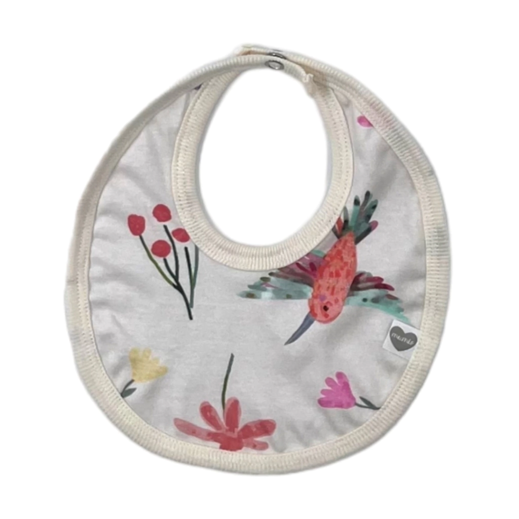 Babero  en algodon doble (estampado de en el frente y blanco liso en el reverso), terminacion en picot a contra tono , broche de bronce niquelado.Ideal para el RN, super suaves a su piel .Medidas: Diametro total : 19 cm . Diametro cuello: 7 cm.  (las medias son aproximadas, ya que se trata de un articulo realizado a mano)