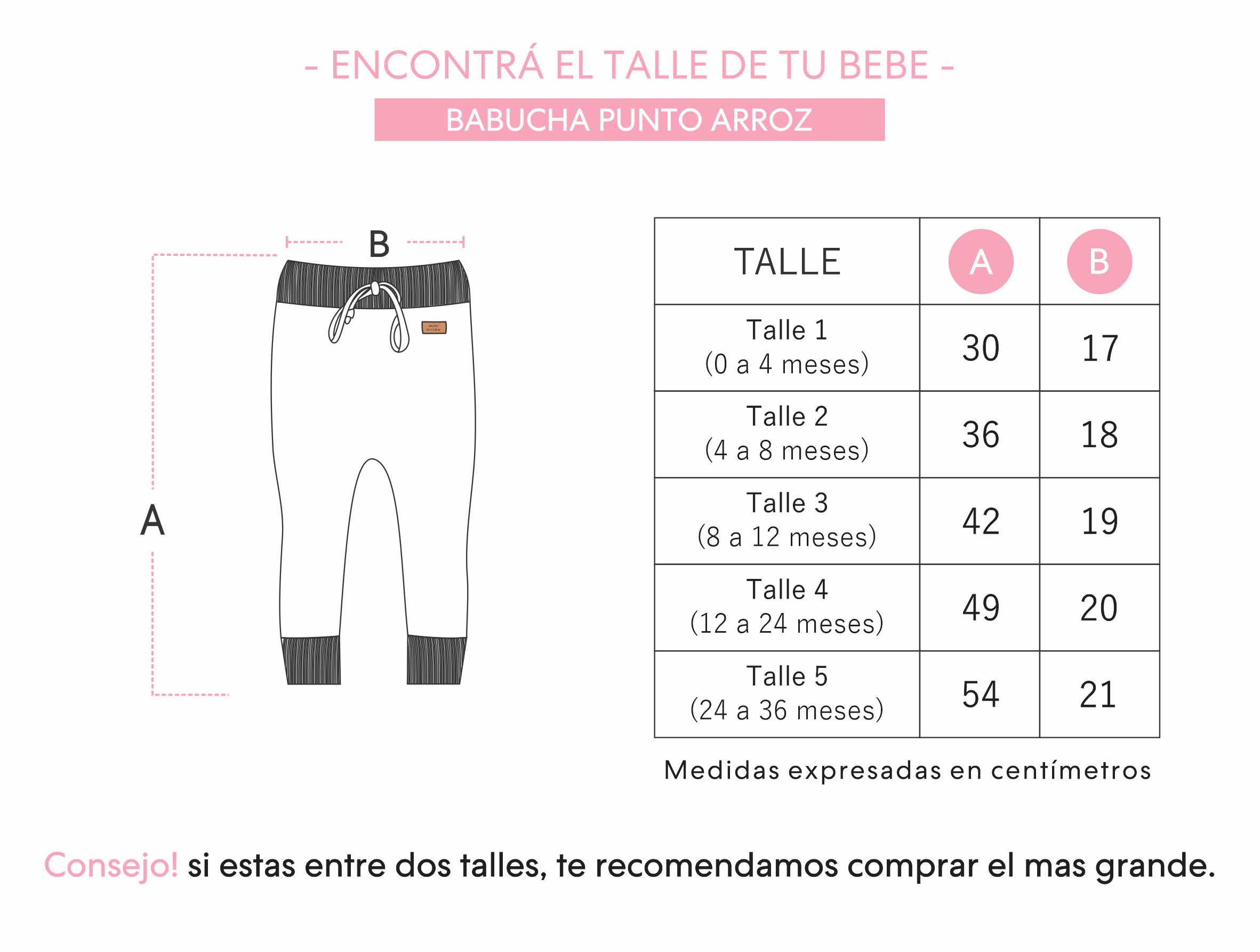 - Guía de talles: Podés utilizarla para comparar con las medidas de alguna prenda de tu bebé. Al tratarse de prendas con procesos manuales puede haber una mínima diferencia entre el producto y la tabla