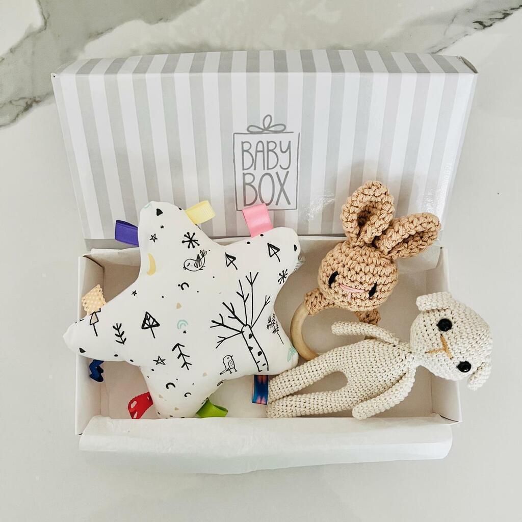 Set de juguetes blandos, especialmente seleccionadas para incentivar y potenciar la estimulación y motricidad fina del bebé en la primera etapa permitiendo que explore distintas formas y dimensiones.Incluye:1 Estrella didactica sonajero1 Osito de crochet1 Conejito de crochet sonajero1 Caja Presentación