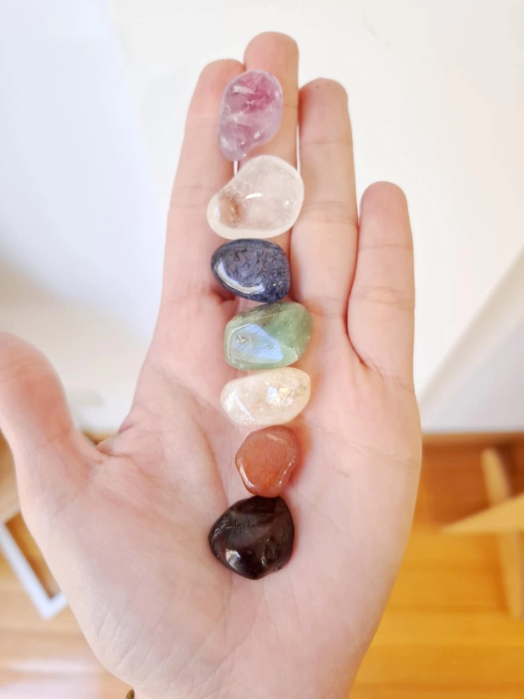 7 piedras que representan los chakras: Cuarzo cristal/ Amatista/ Ágata azul/ Cuarzo verde/ Citrino/Cornalina naranja/ Ojo de buey