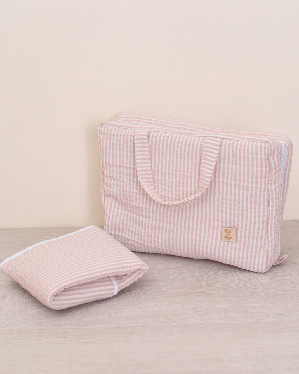 Bolsito cambiador realizado en Tusor rayado 100% algodón.Medidas cerrado: 35 x 23 cm x 8 cm de profundidad.Tiene 2 bolsillos internos grandes con cierre para guardar todo lo necesario para vos y tu bebé.Incluye cambiador portatil de 30 x 50 cm.Las medidas pueden variar unos cm.Todos nuestros productos son aptos lavarropas ciclo delicado.No incluye productos.