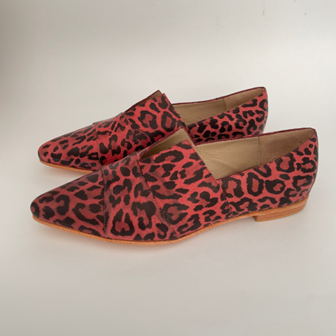 Mocasin confeccionado en cuero vacuno tanto su interior como exterior. Su capellada posee el detalle de recorte en forma de V, con tira de cuero sobre la misma. Suela grupon.