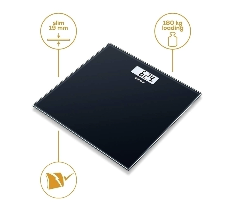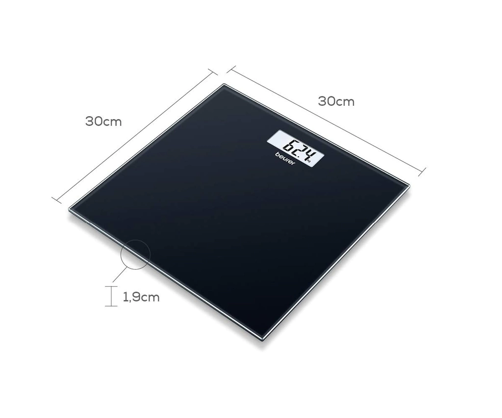 Balanza de Vidrio BeurerCOD: GS 10 NegraGracias a su altura de construcción plana de solo 19 mm, la báscula de vidrio GS 10 es muy fácil de guardar, con lo cual se convierte en el aparato ideal para cuartos de baño pequeños.Características:• Tamaño de la superficie de pesaje en cm 30 x 30• Dimensiones del producto en cm 30 x 30 x 1,9cm• Capacidad de carga/precisión 180 kg / 100 g• Superficie de vidrio de seguridad• Tamaño de los números 26mm• Pantalla LCD fácilmente legible• Altura de construcción plana: solo 1,9 cm• Mecanismo de encendido: Quick Start• Mecanismo de desconexión automática, aviso de sobrecargaGARANTIA OFICIAL 1 AÑO