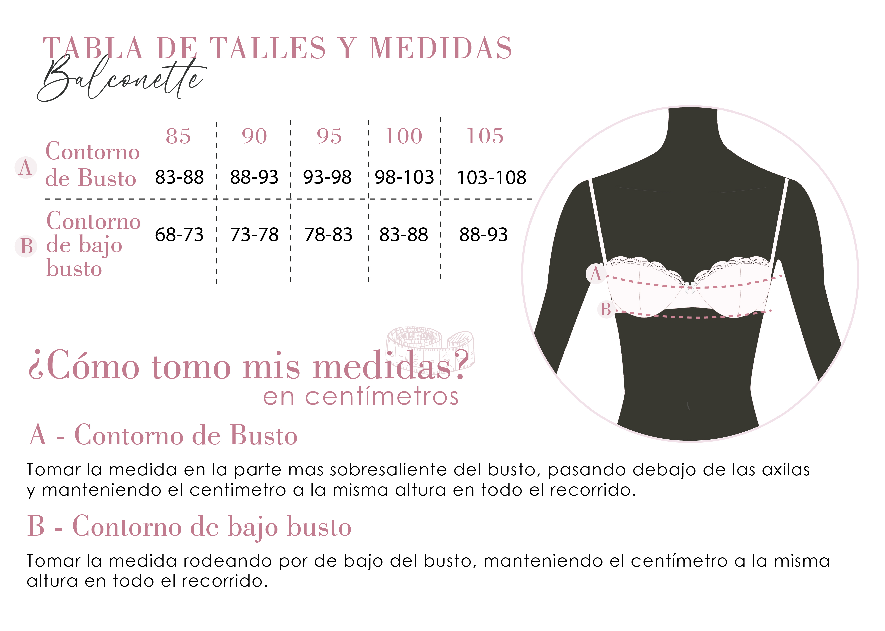 Corpiño Balconette en puntilla. La terminación de la taza es recta, de corte balcón. Tiene aro metálico y breteles desmontables. Talles 85 al 105.