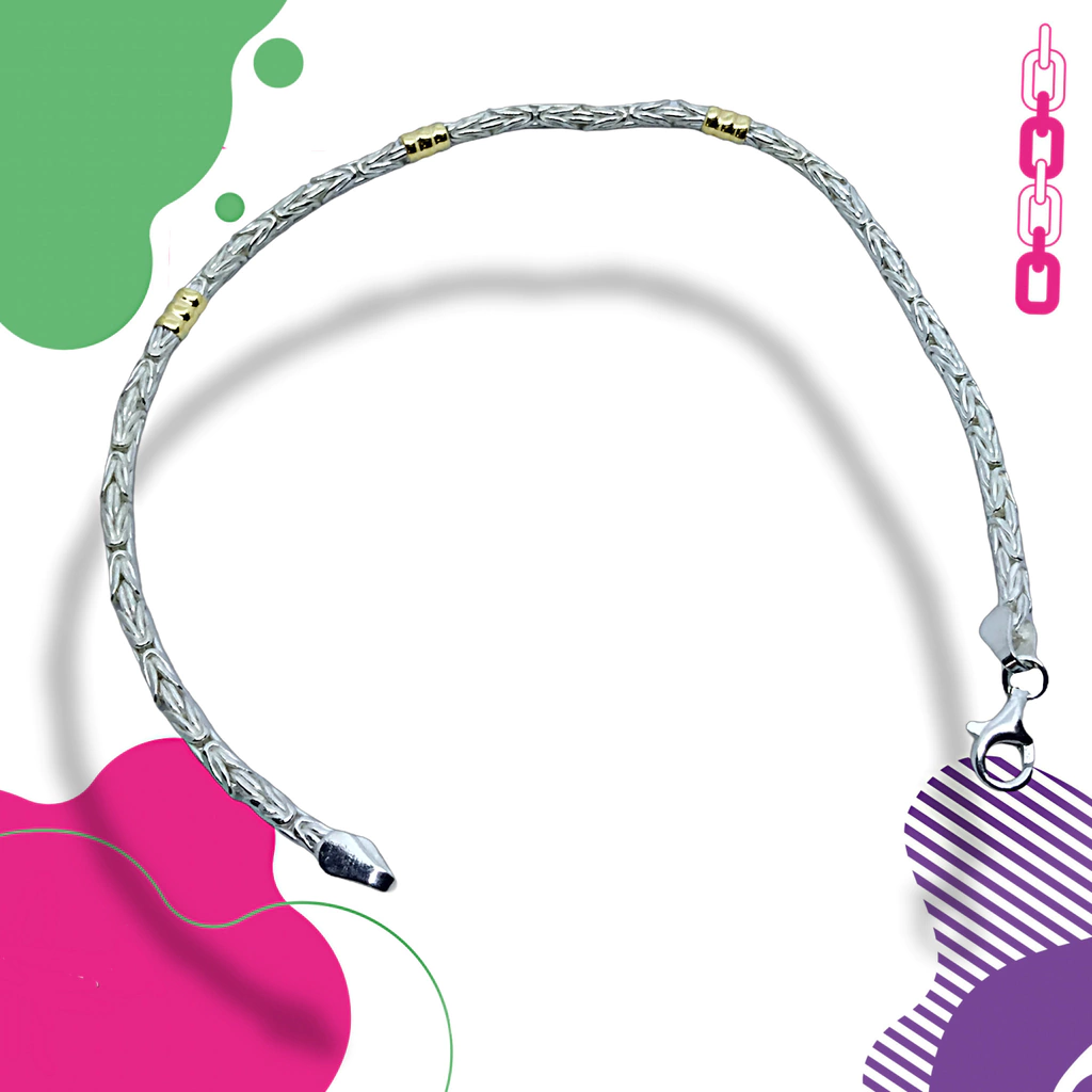 Pulsera maciza de plata 925 con apliques en oro. Cierre mosquetón y terminales en plata 925. Tenemos más grosores, largos y modelos.