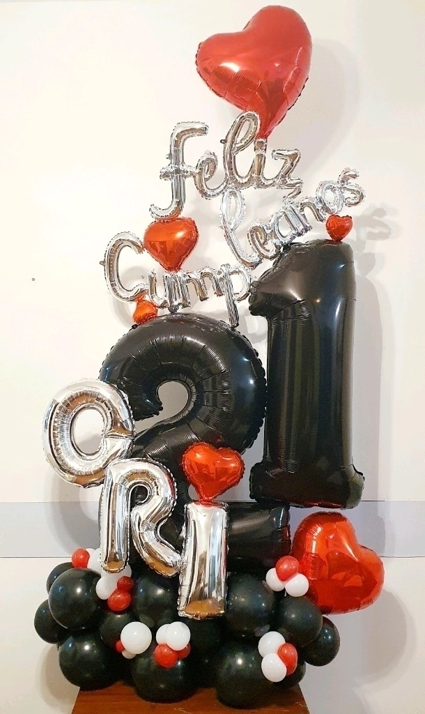 Balloon bouquet New YorkNumero "21" color negro de 100cm.cartel de "FELIZ CUMPLEAÑOS" color plateado.Nombre de tres letras (ORI).Globos de corazones de varios tamaños (9,4 y 18 pulgadas).base de globo de latex.IMPORTANTE:El precio indicado es con la cantidad de letras, números, formas y colores descriptos a continuación. Lógicamente puede variar en caso de que se decida utilizar mayor o menor cantidad de globos.Al entregarse el arreglo ya inflado y terminado, tal cual se ve en las imágenes,este producto sólo está disponible para las zonas de CABA, GBA y MDP. No está disponible la opción de envío a todo el país por correo.