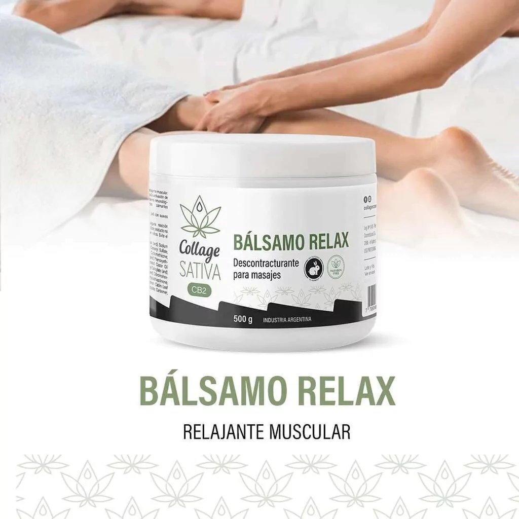 Bálsamo Relax Crema x 250g. Collage SativaCrema para masajes, descontracturante y relajante muscular. Nutre e hidrata la piel. El CB2 refuerza la activación de los receptores dérmicos del sistema inmunológico, brindando propiedades calmantes características de este activo. Recomendado para pieles secas y/o dañadas por el tiempo.CARACTERÍSTICAS:El activo CB2 promueve la intervención de procesos antiinflamatorios de forma orgánica manteniendo la adecuada cohesión entre la piel y sus receptores endocannabinoides.Al mismo tiempo, nutre y relaja brindando bienestar por sus propiedades calmantes.MODO DE USO:Aplicar el bálsamo relax con suaves masajes en la zona a tratar hasta su total absorción