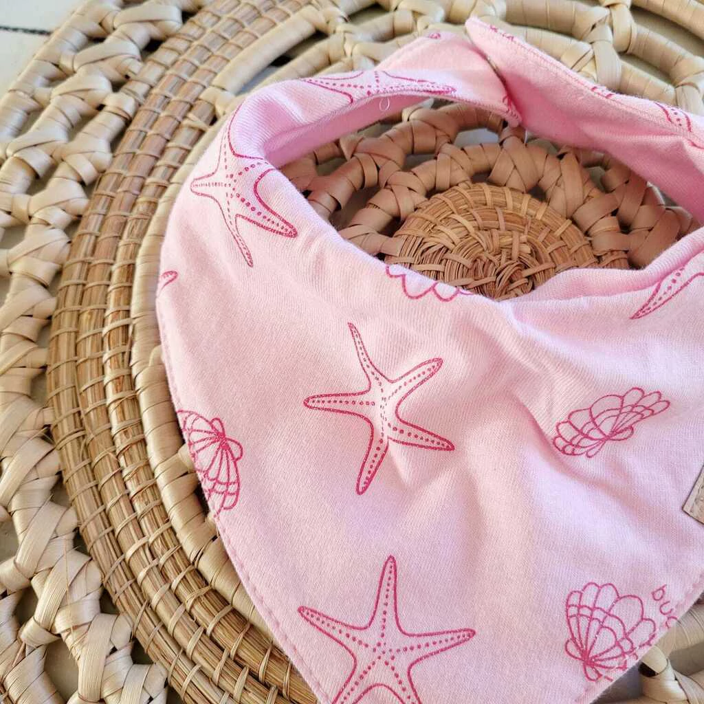 Bandana en color rosa , con estampa de estrellas de mar y caracoles de un lado y del otro en rosa lisa .