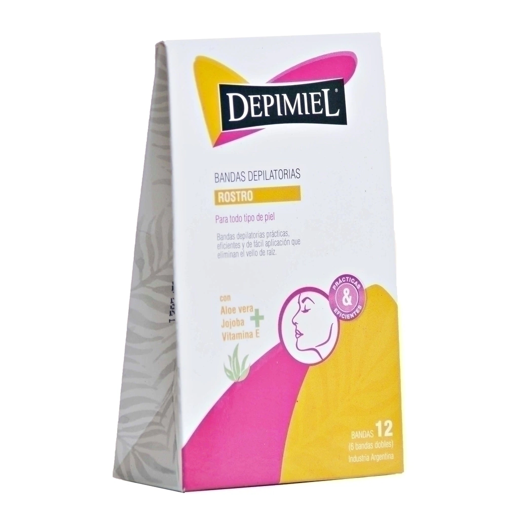BANDAS DEPILATORIAS PARA ROSTRO DEPIMIEL X 12 UNIDADESContenido: 6 bandas dobles por bolsa (vienen 2 bandas adheridas entre si)Aptas para todo tipo de pielesFaciles de usarEliminan el vello desde la raizHasta 4 semanas de duracionModo de uso indicado en el envase