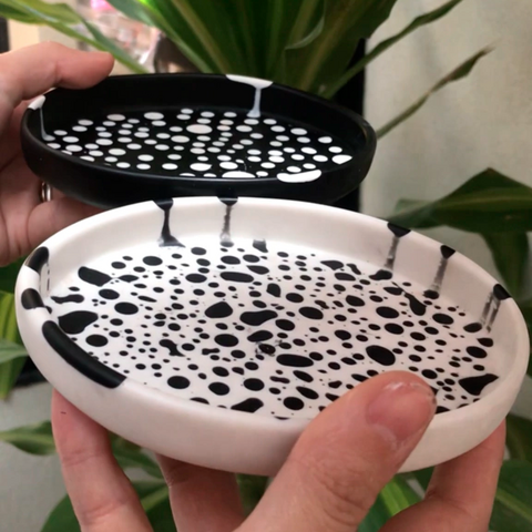Plato-bandeja chico de formato organico. De 12 a 14cm de diametro aprox. Realizado a mano, en resina, de terminacion suave. La resina es fuerte y duradera. No arrojar al suelo o golpear sobre una superficie dura ya que puede romperse o cascarse. Los colores son a modo de muestra, las piezas son unicas, las realizamos para vos. Los tonos pueden variar.