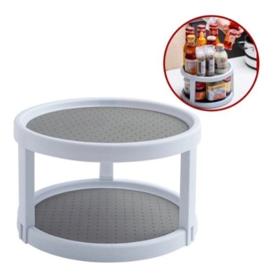 Bandeja giratoria para alacenas Dos pisos encastrables. Color blanco con silicona gris antideslizante- Medidas: 25 cm x 15 cm