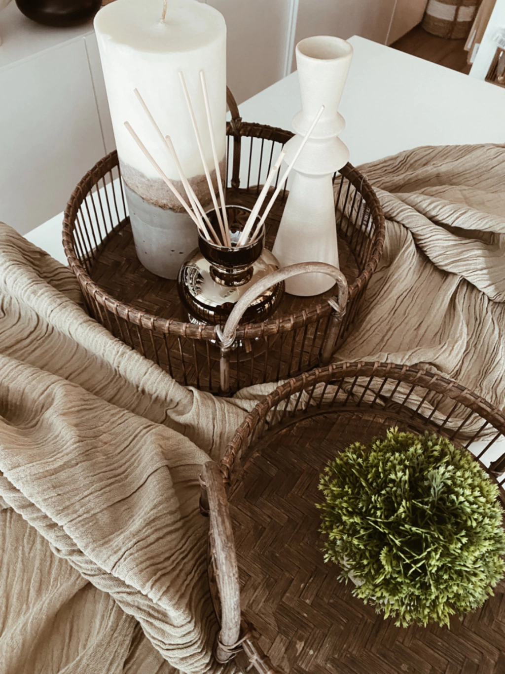 Bandeja redonda de madera y fibras naturales con manijasDisponible en dos medidas:31 cm de diametro x 11 cm de alto25 cm de diametro x 8 cm de alto