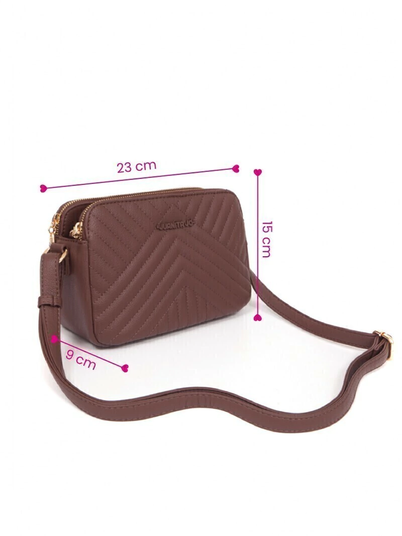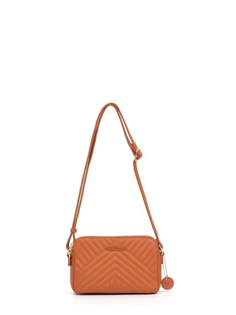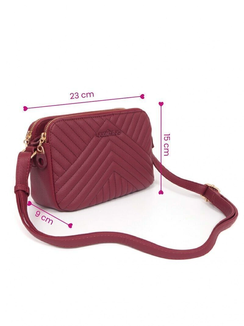 ¡La bandolera que no va a pasar desapercibida es Kers! Este modelo bomba está confeccionada en material alternativo al cuero y es matelasseada ¿Qué quiere decir? significa que es super acolchonadita y muy agradable al tacto. Tiene 3 compartimentos, dos de ellos con cierre y uno con botón imantado. En el interior cuenta con dos bolsillos, uno de ellos con con cierre. A pesar de ser de tamaño pequeño entra de todo. Tiene correa regulable y en la parte trasera tiene un bolsillo antirrobo.¿Qué la hace JUANITA JO?• La chapa, los tiracierres y la forrería Juanita Jo. Estos son diseñados por nuestro equipo y se fabrican en forma exclusiva para nuestra marca.• Pensamos siempre en la funcionalidad.• Etiqueta de PVC interna.• Atemporalidad: ¡Usala en cualquier temporada!Detalles:Las medidas aproximadas (en cm) son:Alto: 15 cm.Ancho:23 cm.Profundidad:9 cm.circunferencia maxima de correa:139 cm.El peso aproximado es (en gramos): 460.Capacidad (medidas aproximadas en cm):Tarjetero 10x8
