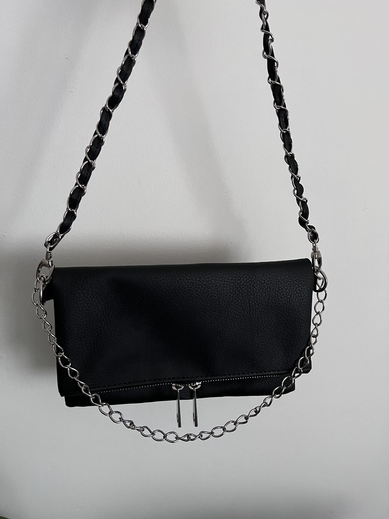 En eco cuero. Interior forrado. Dos bolsillos con cierre. Correa larga trenzada con eco cuero al tono desmontable. Correa corta de cadena fija para podes usarla también como mini bag. Medidas 16 de alto x 25 de ancho.