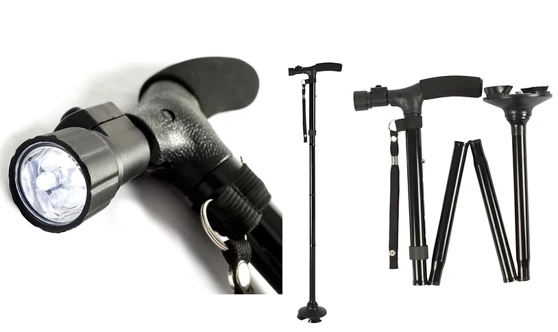 CARACTERÍSTICAS:- Fabricado en material aluminio ultraliviano- Con linterna de LED multidireccional- Terminación: anodizado color negro- Empuñadura acolchada con mango "T"- Mango con linterna (pilas incluidas)- Incluye correa de sujeciónCARACTERÍSTICAS TÉCNICAS:- Plegable en 4 secciones- Regatón con 4 apoyos de 25 mm color negro- Regulable en 5 posiciones- Altura del usuario: 165 - 181 cm- Regulable en altura: 83 - 93 cmPESO DEL BASTÓN: 350grsPESO MÁXIMO SOPORTADO: 100KG