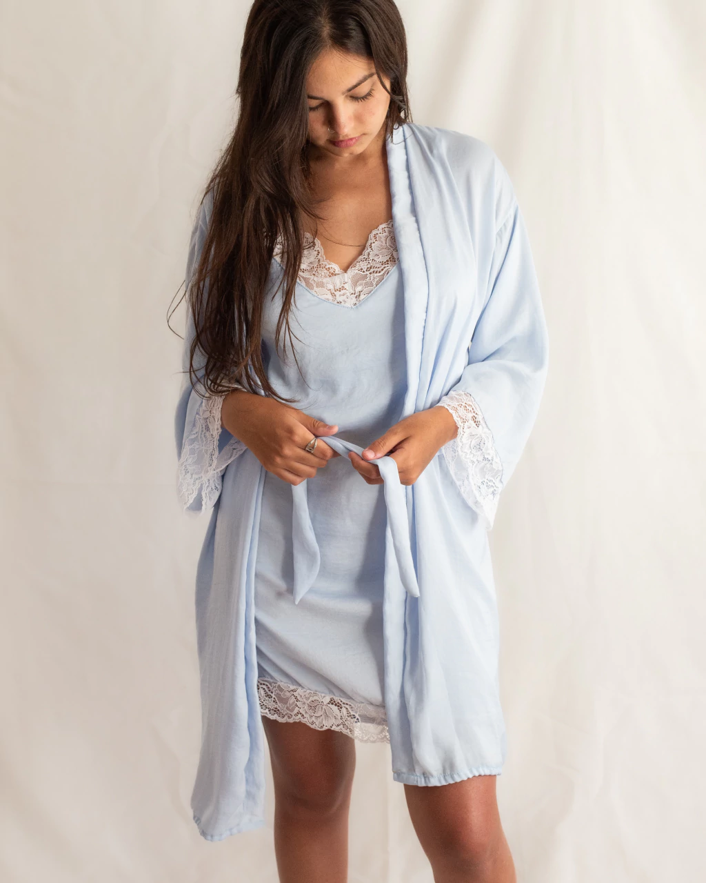 Bata de seda infaltable en tu cuarto. El largo justo para taparte y estás cómoda. Detalles en puntilla en las mangas