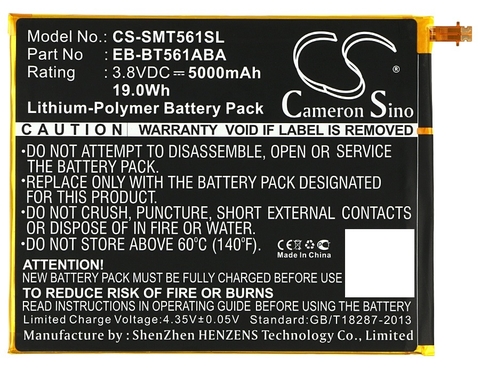 Fit ModelSamsungSM-T560SM-T561Galaxy Tab E Nook Edition 9.6SM-T565Part NumberSamsungEB-BT561ABEEB-BT561ABAItem No.:CS-SMT561SLType:Li-PolymerCapacity:5000mAh / 19.00WhVoltage:3.8vColor:BlackDimension:133.40 x 109.40 x 2.85mmEAN Code:4894128114949Net Weight:78.0g / 2.75ozGross Weight:218.0g / 7.69oz