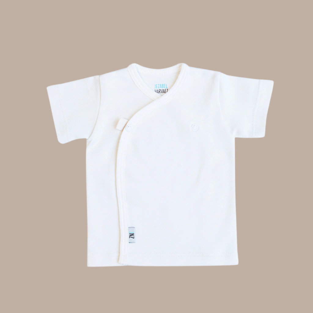 Una batita mangas cortas en color liso cruzada al frente con cierre de dos broches metálicos