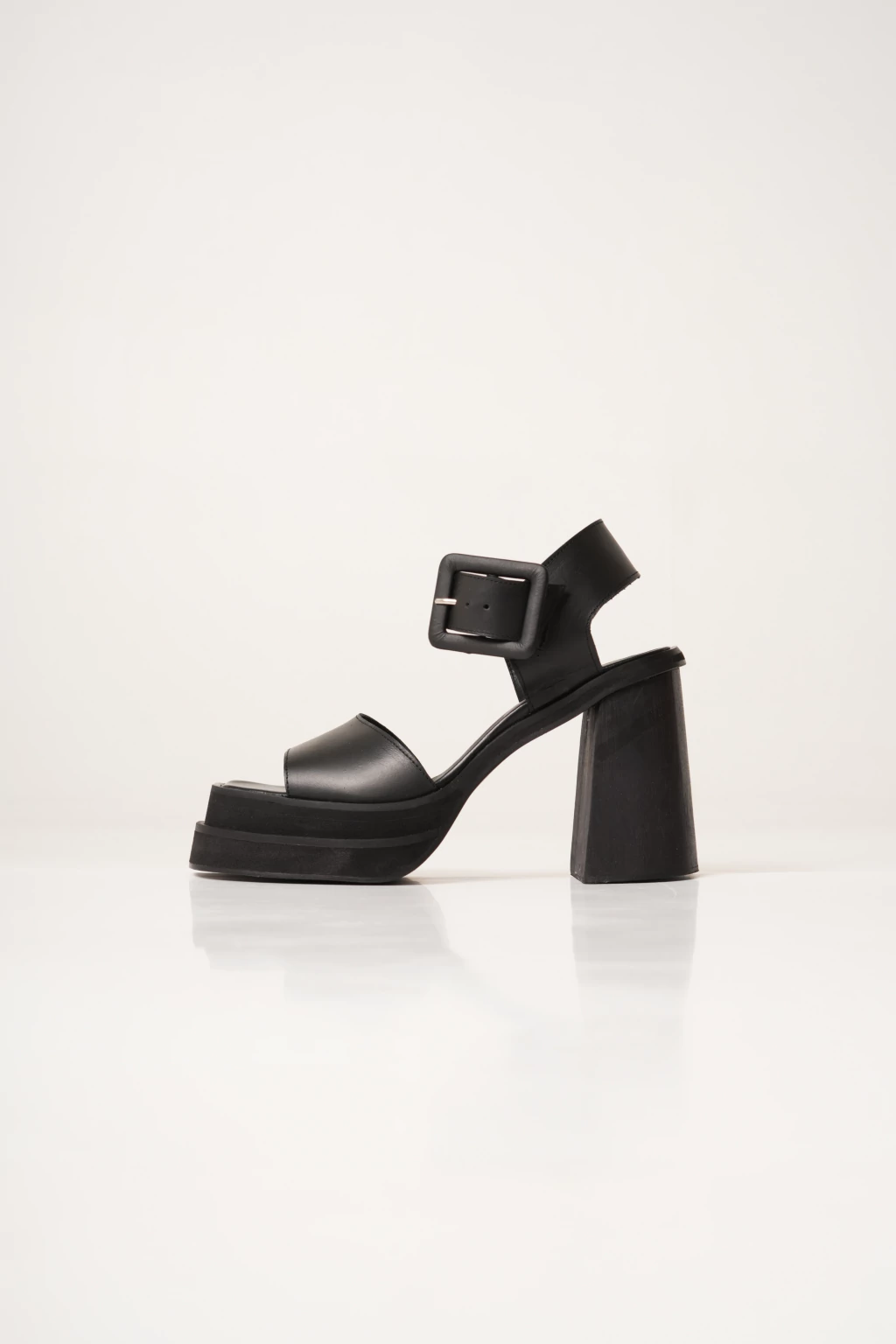 Sandalia de cuero. Hebilla cuadrada de 2x2. Taco de madera de 12 cm, doble plataforma de 5 cm.