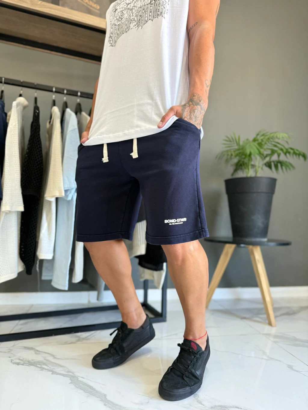 BERMUDA PROCESS GARRETLa bermuda se caracteriza por ser de rustico, con cintura elástica y lavado corrosivo efecto soplete. Tiene estampa institucional BOND STWR en lateral derecho delantero. Esta prenda viene en gris y azul.