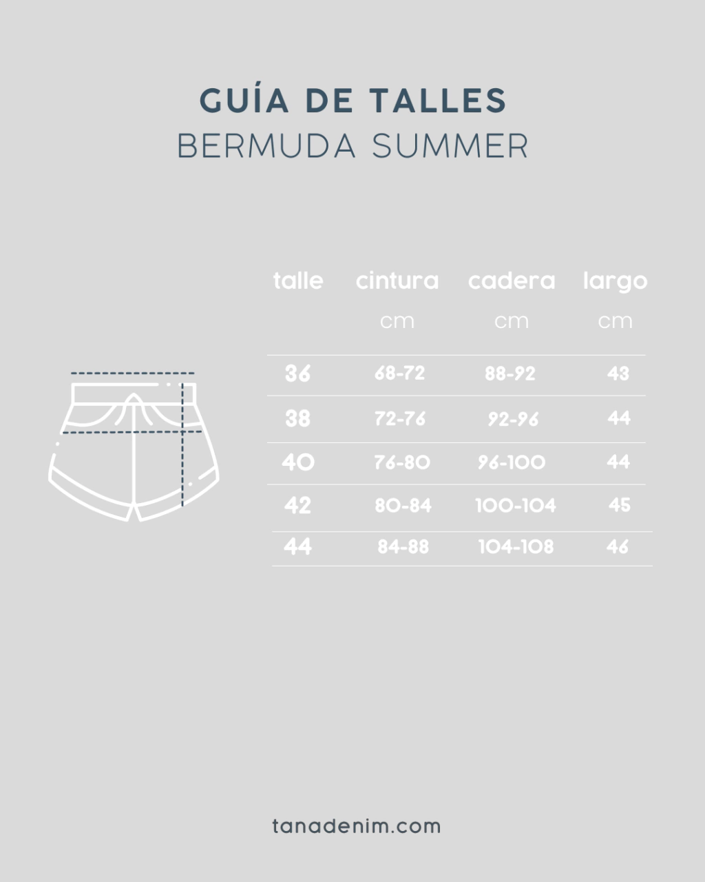 Bermuda SUMMERSUMMER es la elección perfecta para disfrutar del verano con estilo y comodidad. Confeccionada en denim premium y con un diseño de rayas que aporta un toque fresco y moderno, esta prenda es ideal para tus días de sol.Composición de la tela: 100% algodónPeso: 350 gramos/m2Producida con prácticas sustentables, priorizando el cuidado del medio ambiente.MEDIDAS DE LA BERMUDA POR TALLE EN LA ÚLTIMA FOTO DEL PRODUCTOTalle 36: cintura entre 68cm y 72cm, cadera entre 88cm y 92cm, largo 43cm, muslo 54cm , tiro 31cmTalle 38: cintura entre 72cm y 76cm, cadera entre 92cm y 96cm, largo 44cm, muslo 56cm, tiro 31cmTalle 40: cintura entre 76cm y 80cm, cadera entre 96cm y 100cm, largo 44cm, muslo 58cm, tiro 31cmTalle 42: cintura entre 80cm y 84cm, cadera entre 100cm y 104cm, largo 45cm, muslo 60cm, tiro 32cmTalle 44: cintura entre 84cm y 88cm, cadera entre 104cm y 108cm, largo 46cm, muslo 60cm, tiro 33cmEn las fotos Nicky está usando el talle 36 y sus medidas son:Altura: 1,61mBusto: 80cmCintura: 60cmCadera: 89cm¡Ante cualquier duda contactanos a whatsapp y te ayudamos!