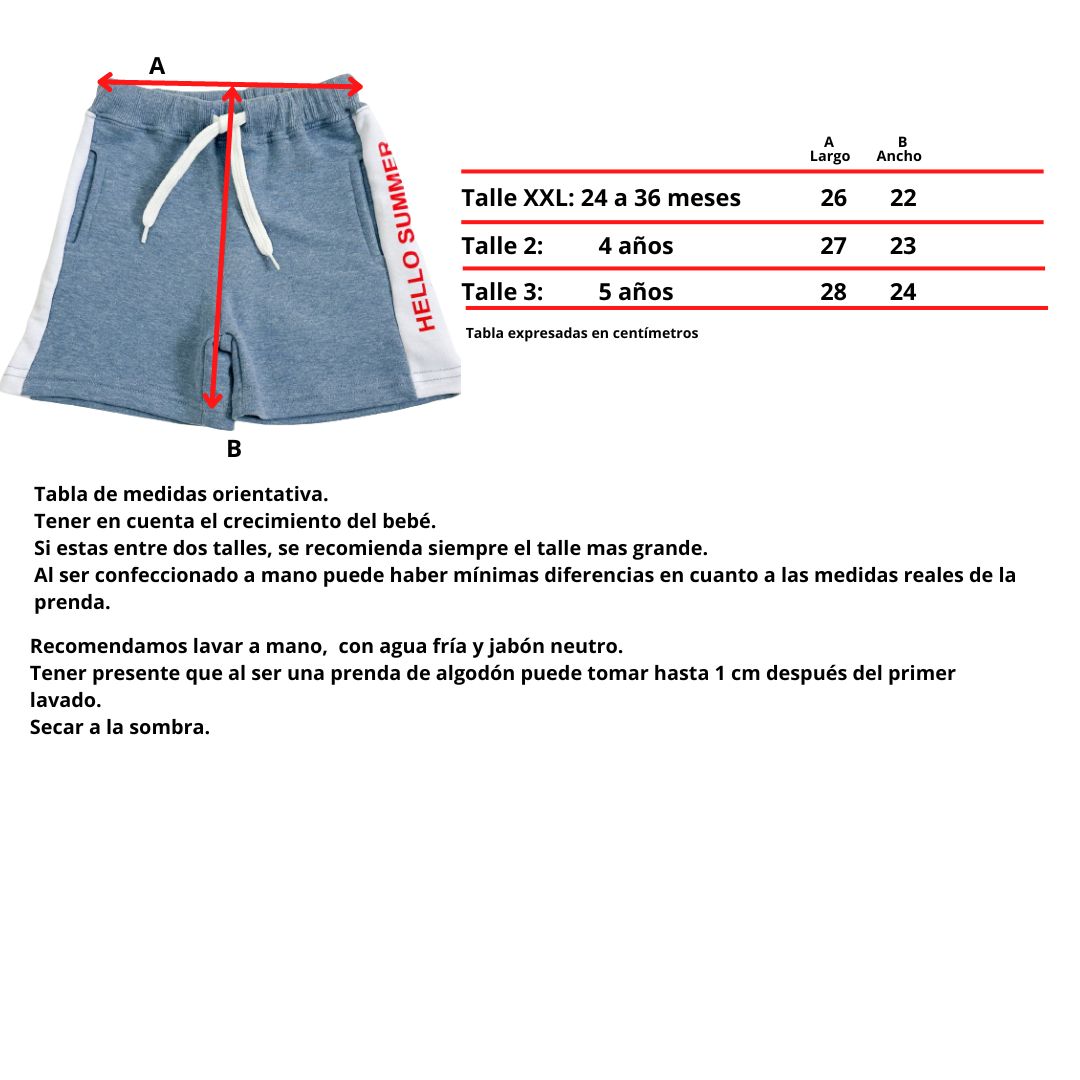 Bermuda canchera y linda confeccionada en rústico jaspeado con recorte blanco en los laterales y estampa veraniega.