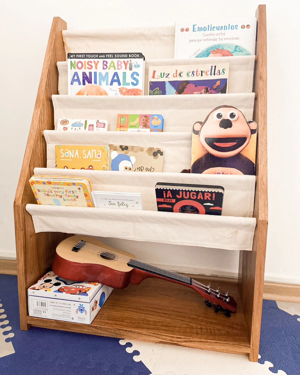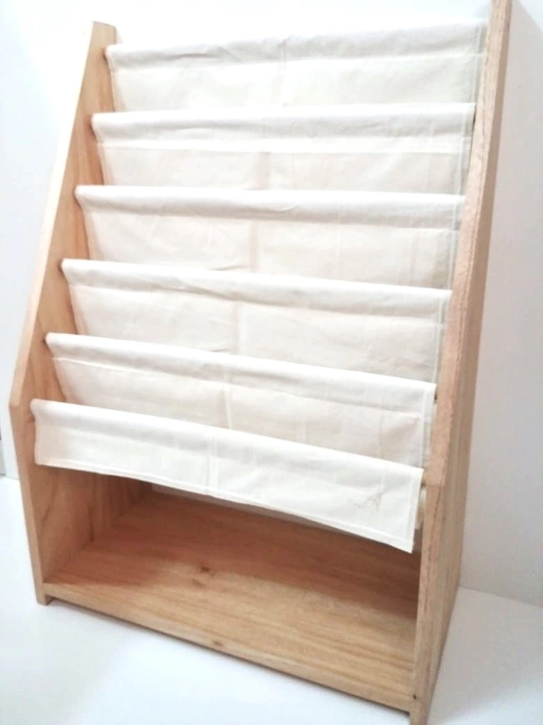 Es importante que los libros tengan la tapa de frente, así pueden elegirlos ellos mismos según lo que les llame la atención.Biblioteca de tela con 5 bolsillos y espacio de guardado abajo.Realizada en paraiso (mdf enchapado) y lienzo.La tela se puede sacar para lavar.Medidas: 85cm de alto x 60cm de ancho x 30cm de profundidadAtención: todos nuestros pedidos son por encargo. Tiempo de entrega 10/15 días aprox.