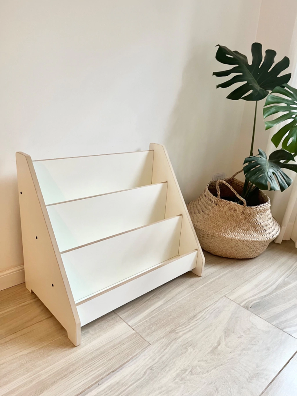 Biblioteca montessori madera y blanco, ideal para que los chicos tengan los libritos a su altura!
