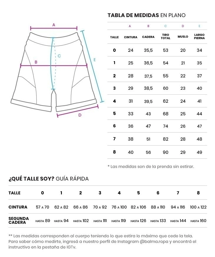 Esta prenda esta en precio promocional online, ya que es de temporadas anteriores y ya no la producimos. Tene en cuenta que tiene cambio unicamente por prendas que se encuentren en la misma categoria. Los unicos talles disponibles son los que figuran en la web, recomendamos chequear disponibilidad.Calza corta tipo biker de lycra compuesta por 6 recortes delanteros y dos bandas laterales intergrament cosida con over de 5 hilos tiro alto con costura de seguridad y bordador en hilo blanco, con cintura con elástico de 4cm. Trasera entera sin recortes ni bordados.Si ya tenes bikers BALMA de temporadas anteriores vas a notar que subimos un nivel en calidad de lycra manteniendo la moldería de nuestras bikers de recortes de siempreModelo foto 1 usa talle 0Modelo foto 2 usa talle 5Encontras la tabla de talles en la última foto a la derecha