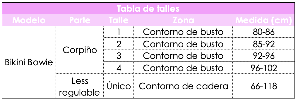 Está compuesta de un triángulo con armado desmontable, breteles regulables y que se ata en la espalda. Su less es regulable, talle único.