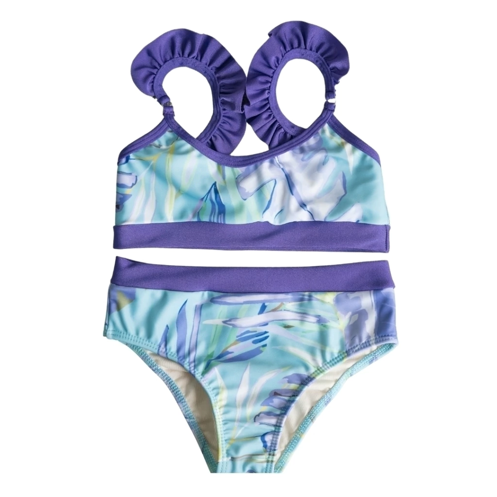 Bikini para niña con volados en los breteles. Contiene y modela. El calce de esta prenda es elastizado, al cuerpo.