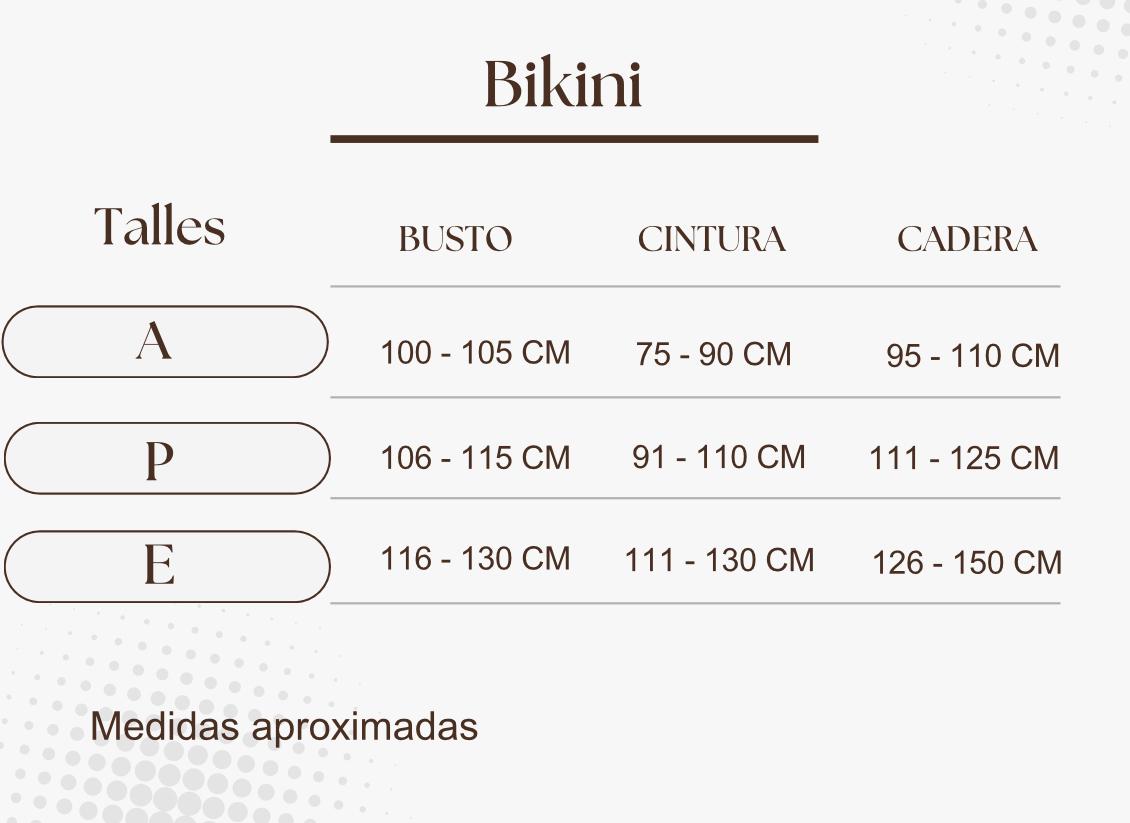 Consultá nuestra tabla de medidas en la imagen para asegurarte de que tu bikini te quede perfecta.