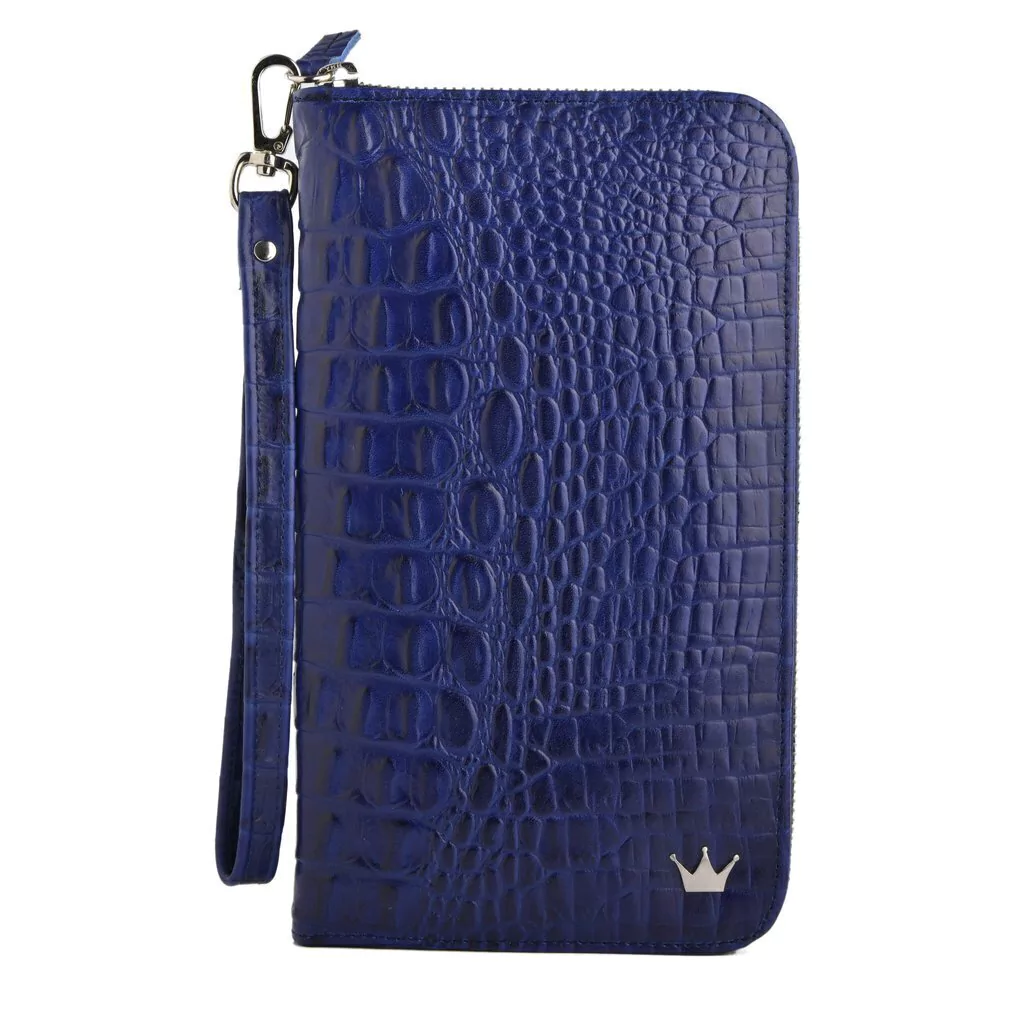 Diseño: Exterior de cuero vacuno color azul. Herraje de la corona bañado en níquel.Interior de cuero azul liso. Nombre de la marca en hot stamping plateado.Cierre y correa desmontable.Capacidad:Posee 17 compartimientos independientes para tarjetas, 2 bolsillos para billetes y 2 bolsillos adicionales para papeles, monedero y espacio para celular y pasaporte.Materiales:Exterior e interior 100% cuero argentino. Forrado 100% algodón color azul francia.Medidas:Alto 22,5 cm.Largo 13 cm.Ancho 2,5 cm.Color: Azul.Colección Permanente.Industria Argentina.