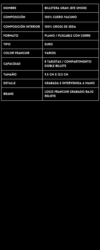 Descubre la Billetera Gran Jefe smoke, una pieza única que combina la elegancia del arte en cuero con el toque personal de ser grabada e intervenida a mano. Su diseño exclusivo y limitado la convierte en un accesorio imprescindible para quienes valoran la distinción y la calidad.