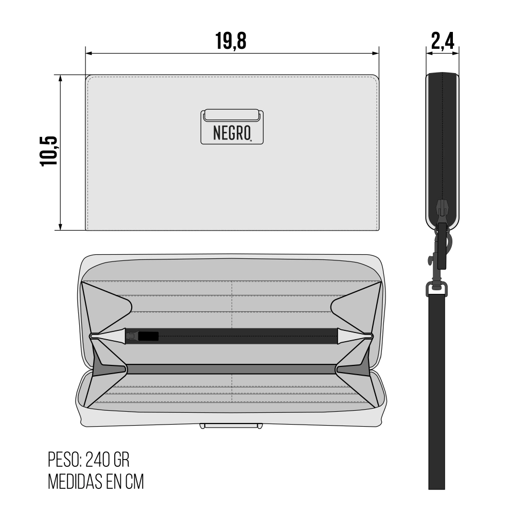 NUEVA Billetera de cuero vacuno graneado con cierre perimetral tipo impermeable y logo metálico negro.Tiene dos compartimento internos forrados para billetes y 8 espacios para guardado de tarjetas + un bolsillo con cierre.cinta de muñeca de cuero con mosquetón metálico ( NUEVO)Medidas: 19.8 cm x 10.5 cm x 2.4 cm