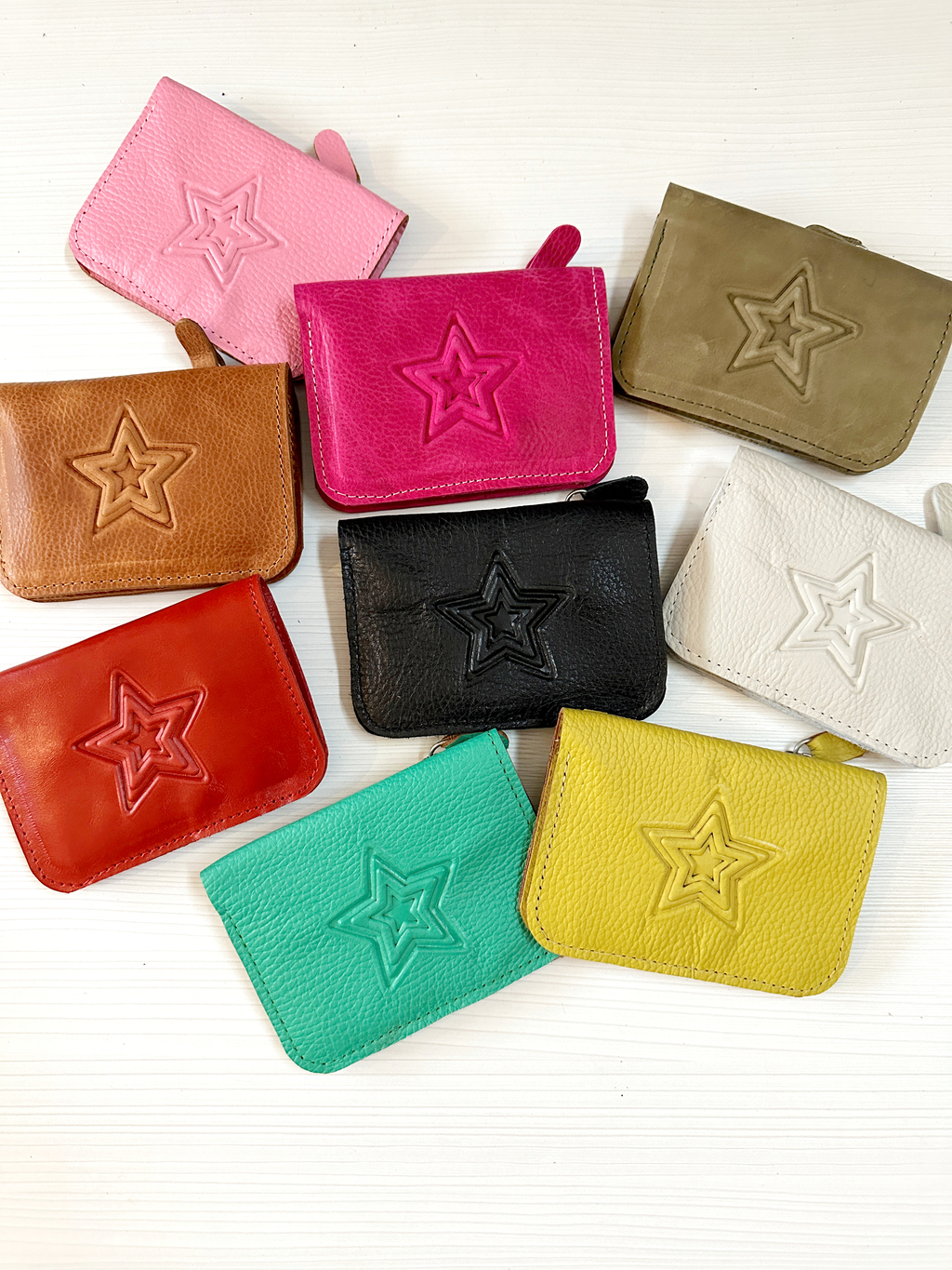 Billetera confeccionada en cuero 100%, estampado mediante gofrado. Posee cierre en la parte trasera.