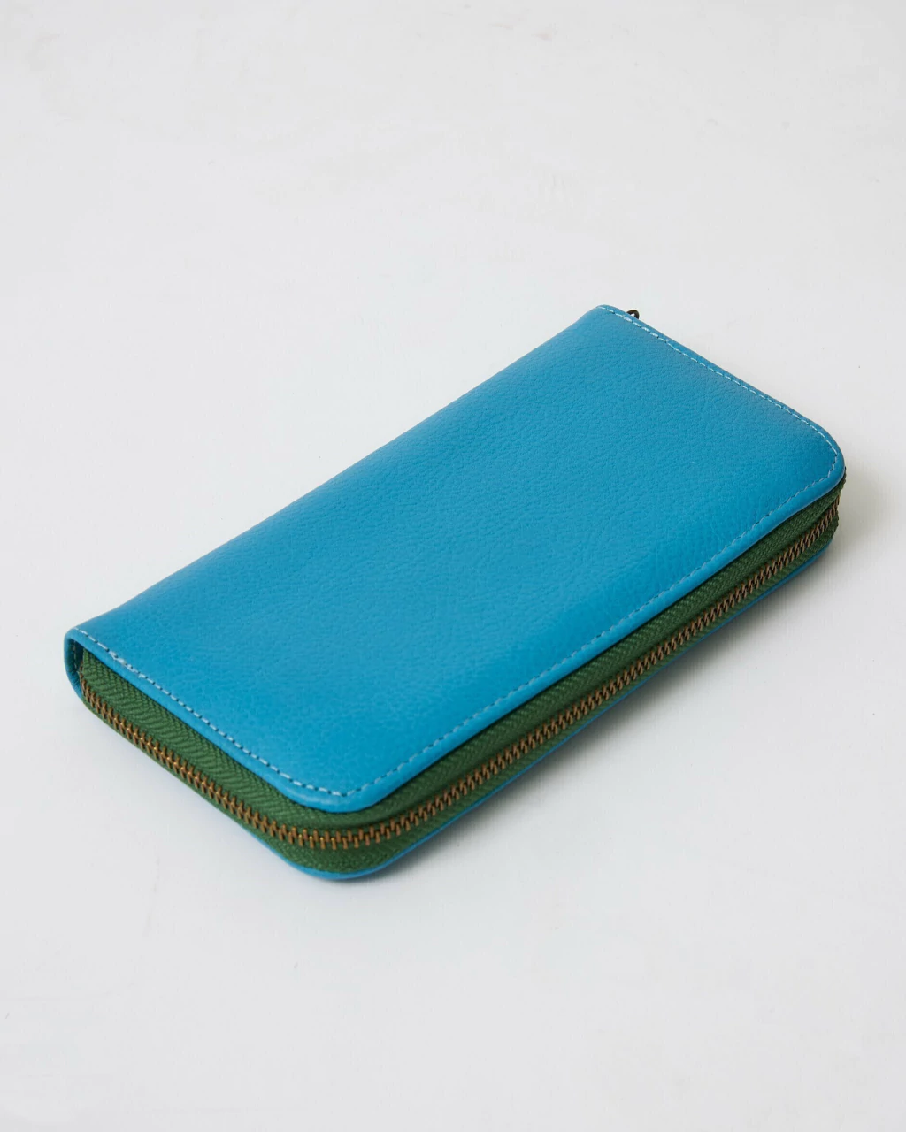 La billetera Peggy turquesa graneado es perfecta para guardar todo eso que necesitas. Por su tamaño y practicidad se adapta a cualquier situación de uso. Tiene una apertura tipo sobre con un cierre color verde que le da ese toque trendy y canchero. Tiene capacidad para seis tarjetas y tres bolsillos a lo largo para guardar los billetes sin tener que doblarlos. Además, en el centro cuenta con un bolsillo monedero con cierre forrado en lienzo de algodón negro. Esta billetera es ideal para que guardes todas tus tarjetas y mucho más!Confeccionada 100% en cuero vacuno. El exterior es de cuero graneado color turquesa y el interior es de cuero graneado color celeste.Altura: 20cm - Ancho: 10cm - Profundidad: 2,5cm