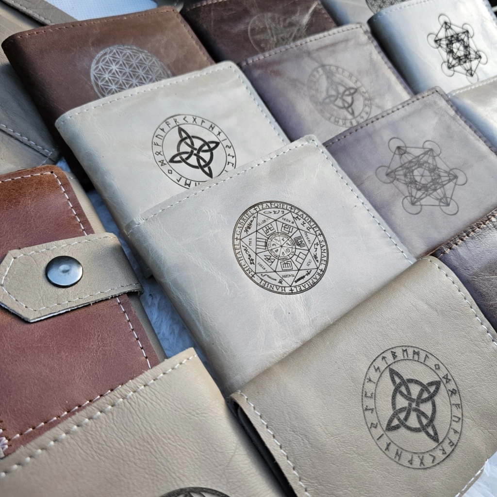 Llevá tus símbolos de protección favoritos ahora en estas hermosas de cuero natural con símbolos grabados a láser. Las billeteras son muy espaciosas, delicadas y elegantes, suaves al tacto, elaboradas con una excelente relación precio-calidad, ideal para uso personal o regalo.Dos modelos disponibles:Ladoble volante o librito, en color Beige bisón clarito o Marrón suela oscura, esta cuenta con una división de dos compartimientos para colocar billetes y 8 compartimientos para tarjetas en sus distintas hojas o volantes. Los grabados están realizados en la cara frontal.Elmodelo con broche, estilo pequeña cartera , en colores combinados de Beige Bisón + Marrón suela, esta poseé un cierre por broche para evitar aperturas no intencionadas, cuenta con una division para billetes y 7 compartimientos para tarjetas. Los grabados se realizan en la parte dorsal, dónde hay más espacio, salvo algun que otro diseño que re realiza en las esquinas frontales.Tener en cuenta, que al ser cuero natural, el tono puede variar un poquito respecto a las fotos, igual que la intensidad o color de grabado, el cual se hace para que sobresalga lo más posible. Los grabados se destacan muy bien sobre fondos claros.Podés seleccionar el símboilo que más te guste dentro de los disponibles en las variantes. Por el momento no hacemos pesonalizados individuales, solo si es al por mayor.