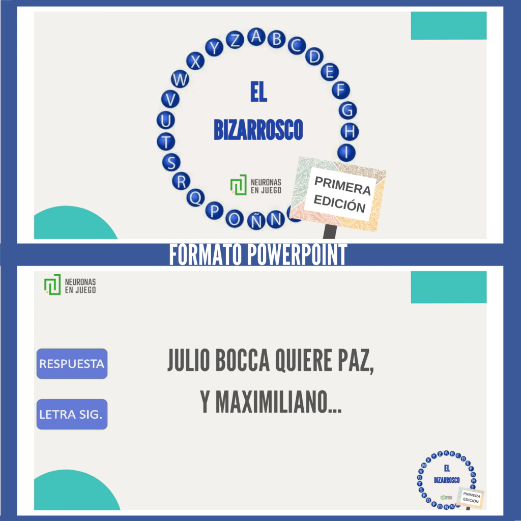 BIZARROSCO PRIMERA EDICIÓNFORMATO POWERPOINTEl BIZARROSCO es ideal para talleres grupales donde se busca el entretenimiento y el trabajo cognitivo.Cada letra se corresponde con una consigna que hará reir a los participantes y los llevará a recordar viejos tiempos.ACLARACIÓN: EL MATERIAL CONTIENE UNA CONSIGNA POR LETRA Y PRESENTA VARIAS REFERENCIAS A PALABRAS Y PERSONAJES ARGENTINOS.UNA VEZ RECIBIDO EL PAGO, EN EL TRANSCURSO DE LAS 2 HS POSTERIORES, RECIBIRÁS UN EMAIL CON EL LINK DE ACCESO. POR LAS DUDAS CHEQUEÁ SPAM O CORREO NO DESEADO. (SI LO HICISTE POR TRANSFERENCIA BANCARIA, NO OLVIDES REMITIRNOS EL COMPROBANTE POR EMAIL).POR FAVOR ANTE CUALQUIER DUDA, CONTACTANOS.