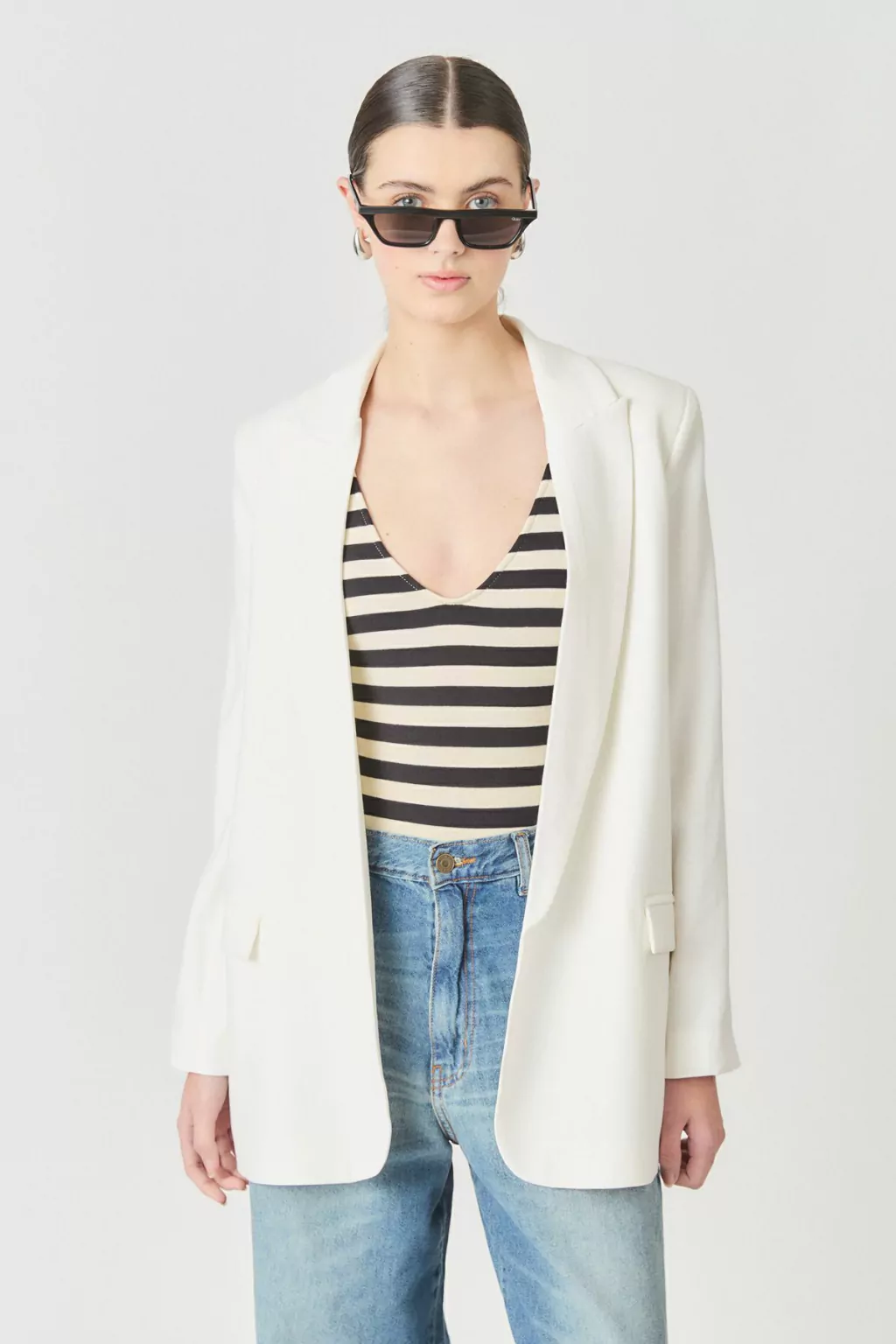 Blazer de rayón, de calce holgado. Este blazer sin botón, posee bolsillos en delantero y una solapa amplia redondeada, largo a la cadera. Ideal para utilizar tanto de día como de noche.