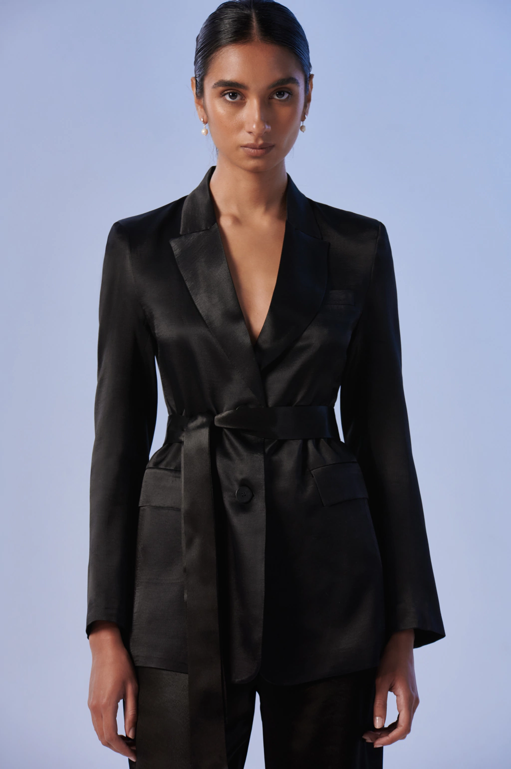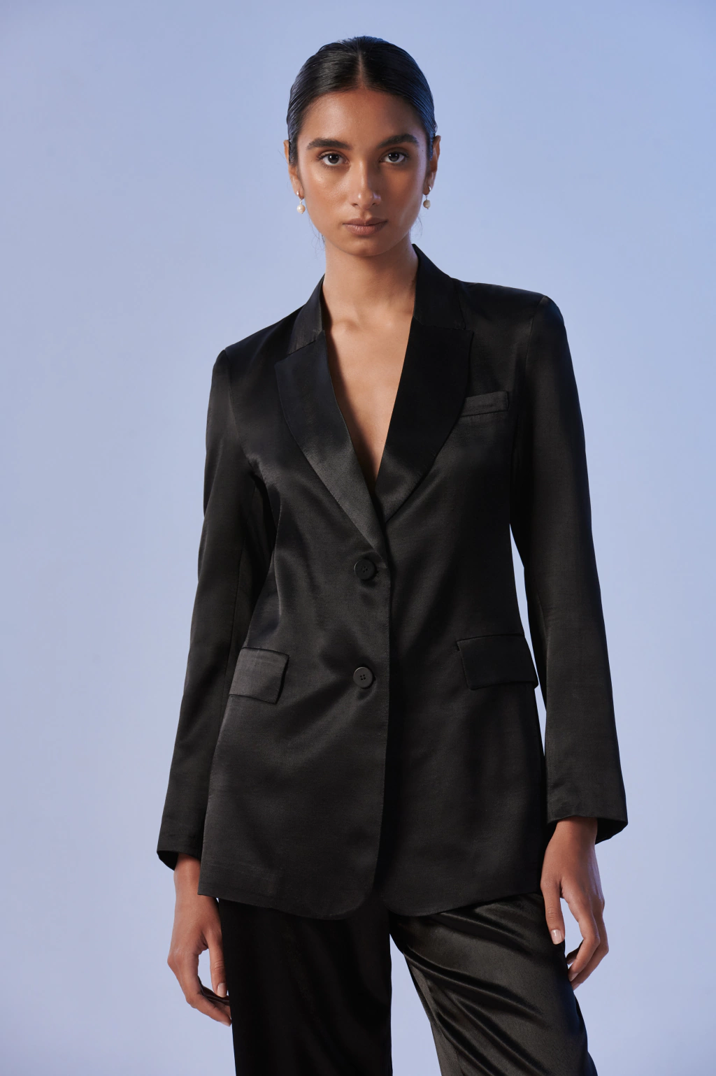 Blazer confeccionado en Satén Premium. De silueta recta con dos botones de pasta en delantero, bolsillo smoking en el frente y bolsillos con solapa. Posee lazo desmontable del mismo textil.