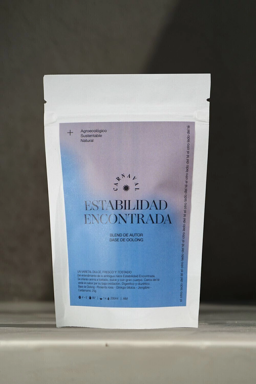Blend de té - Estabilidad Encontrada,varietal dulce, floral y tostadoDel entendimiento de lo ambiguo nace Estabilidad Encontrada.De intenso aroma a tostado, dulce y con gran cuerpo. Cerca del té verde en sabor por su baja oxidación, Estabilidad encontrada se compone de hojas de té enrolladas formando bolitas que se abren al infusionarlas.Digestivo y expectorante.-BLEND DE AUTOR :Base de Oolong - Pimienta rosa - Ginkgo biloba - Jengibre - CardamomoTiempo de infusión: 3'Temperatura: 85°cCantidad: 1cda x 200mlAMPeso neto: 25gIndustria ArgentinaHecho artesanalmente por Carnaval Tea