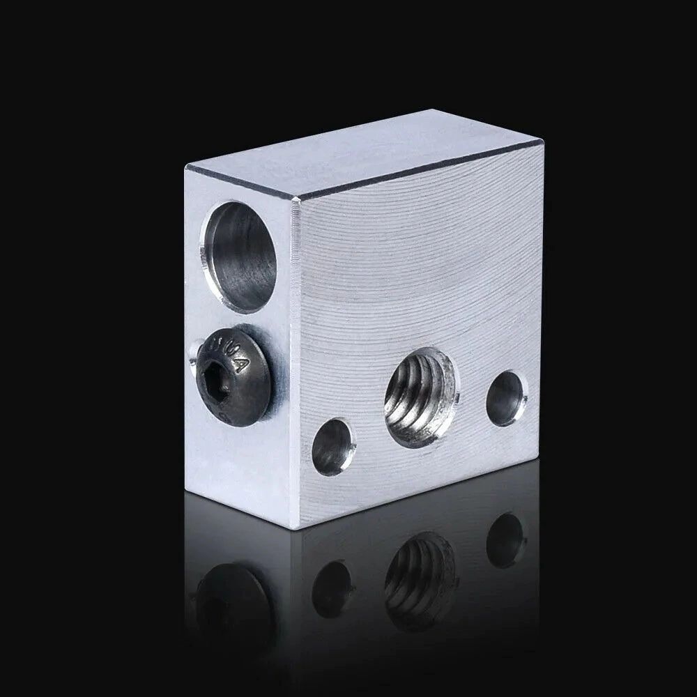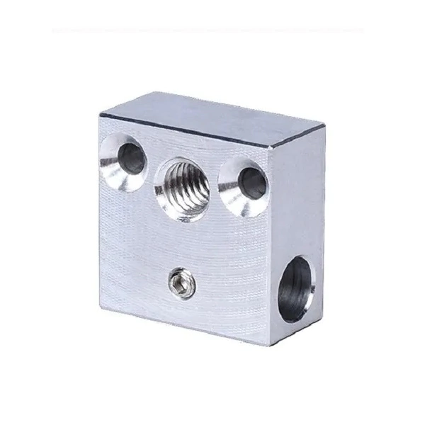 Bloque calefactor para impresoras Creality Ender 3, Ender 3 Pro, CR10, CR10S, etc., con mecanizado de precisión y tratamiento superficial niquelado.- Material: Aleación de aluminio niquelado- Dimensiones: 20x20x10mm- Rosca para nozzle: M6- Compatible con cartucho calefactor de 6x20mm
